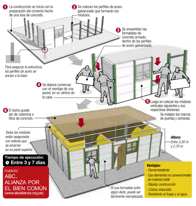 La vivienda tiene las siguientes características: Losa de concreto de 10cm. Muros de plaquetas de concreto y perfiles metálicos. Techo viguetas de madera, machihembrado de madera y cobertura de fibrocemento. Instalaciones eléctricas e instalaciones sanitarias, carpintería de madera de puertas y ventanas, piso de cemento pulido, enchape cerámico de baño, vidrios.